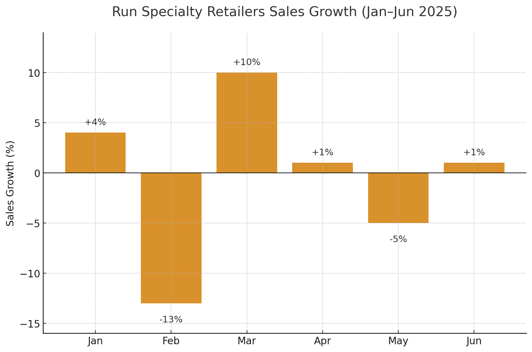 Looking at January through June 2025, the run specialty channel showed some sharp swings, a steep drop in February followed by a double-digit rebound in March. Weather may have been a factor (spring arrived late in many regions), but looking back at 2024 doesn’t provide much clarity either: Q1 was up 4% yy, Q2 was flat, Q3 gained 4%, and Q4 surged 10%.