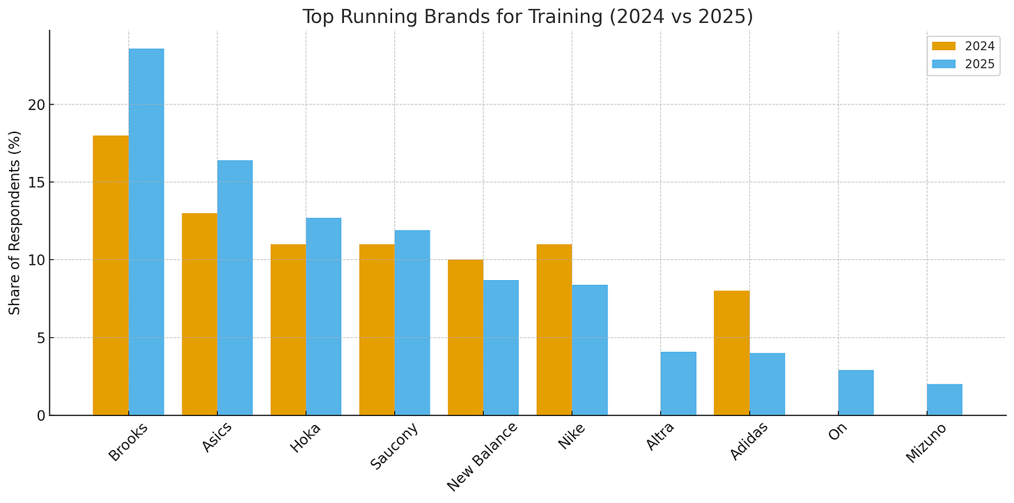Brooks never lost its No. 1 spot, but it roared back in 2025. That lines up with the brand’s 2Q25 earnings update, where North American sales rose 13% year over year and every global region delivered double-digit growth. Brooks called out its Glycerin line (up 27%) as the main driver, with Ghost (+16%) and Ghost Max (+82%) also surging.